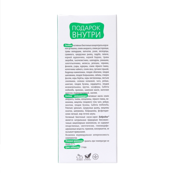 Состав: нативные биогенные концентраты корзинок артишока, семян амаранта, семян расторопши, травы володушки, лапчатки, уснеи, леспедецы, гравилата, кукурузных рылец, падуба, лапачо, корней одуванчика, корней бадана, травы зверобоя, тысячелистника, календулы, ромашки, золототысячника, мелиссы, репешка, черники, фенхеля, узары, куркумы, семян чёрного тмина, копеечника чайного, семян овса, гречихи горькой, бедренца-камнеломки, плодов облепихи, плодов шиповника, плодов боярышника, свеклы, створок фасоли, коры берёзы, коры лиственницы, листьев земляники, солянки холмовой, чаги, рейши, шиитаке, плодов бузины, кордицепса, плодов можжевельника, ярутки, зизифоры, Galleria mellonella, прополис, каменное масло, маточное молочко, подмор пчелиный, зооглея.