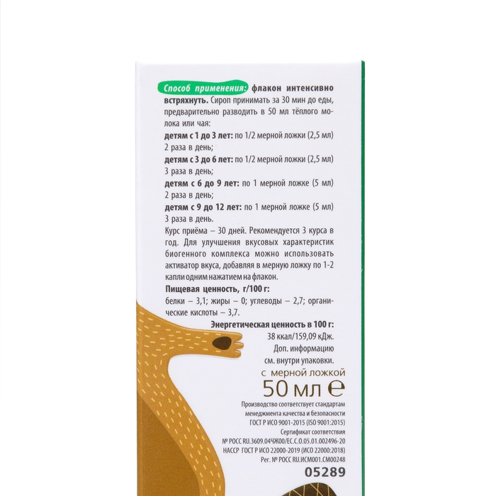 Способ применения: флакон интенсивно встряхнуть. Сироп принимать за 30 мин до еды, предварительно разводить в 50 мл тёплого молока или чая: детям с 1 до 3 лет: по 1/2 мерной ложки (2,5 мл) 2 раза в день; детям с 3 до 6 лет: по 1/2 мерной ложки (2,5 мл) 3 раза в день; детям с 6 до 9 лет: по 1 мерной ложке (5 мл) 2 раза в день; детям с 9 до 12 лет: по 1 мерной ложке (5 мл) 3 раза в день. Курс приёма – 30 дней. Рекомендуется 3 курса в год.