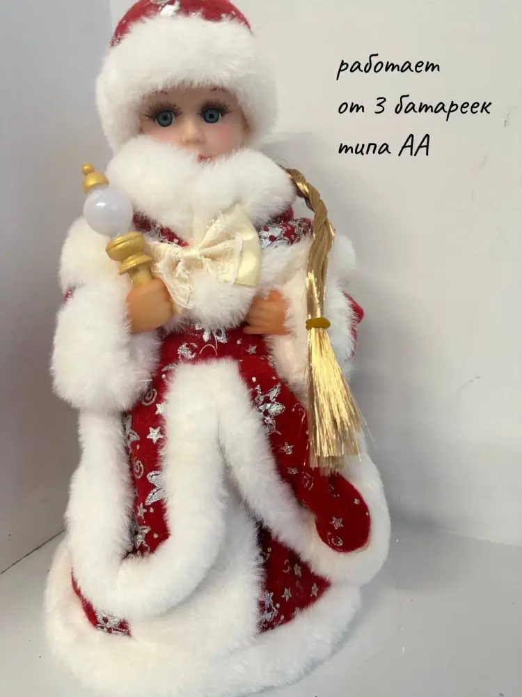 Снегурочка работает от трех батареек типа АА. Подарите себе мгновения радости и волшебства в этот Новый год!