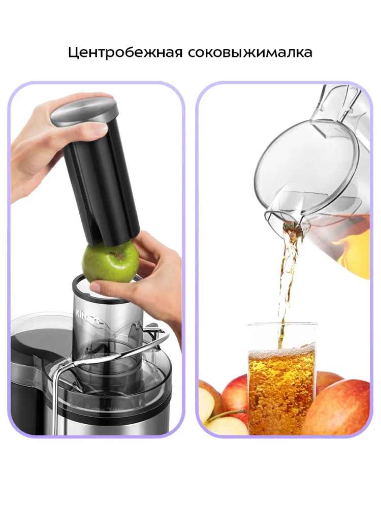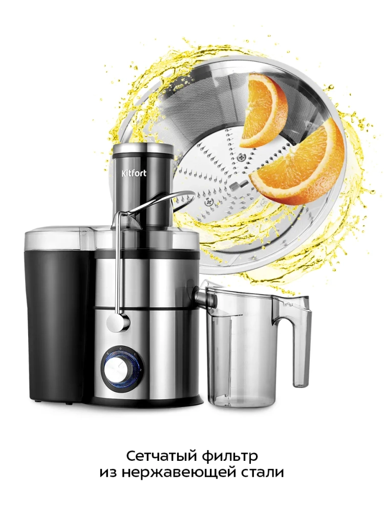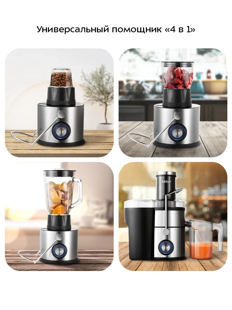 Центробежная соковыжималка «4 в 1» Kitfort КТ-1153 сочетает в себе функции четырех устройств: соковыжималки, блендера, измельчителя и роторной кофемолки.