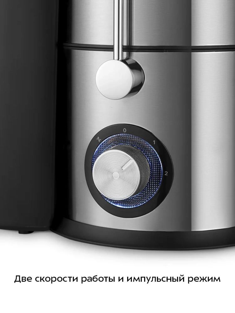 Для продуктов разной твердости предусмотрено 2 скорости и импульсный режим. За счет большого диаметра загрузочной горловины можно загружать крупные продукты: целые яблоки, морковь и т.д. Фильтр сделан из нержавеющей стали, что делает его прочным и не подверженным коррозии. В контейнере для сока предусмотрен щелевой фильтр для отделения пены от сока.