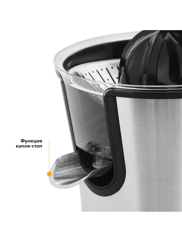 Соковыжималка оснащена сливным носиком, который вручную поднимается вверх, чтобы с него не стекали капли. Противоскользящие ножки не дают прибору скользить по столу во время отжимания сока.