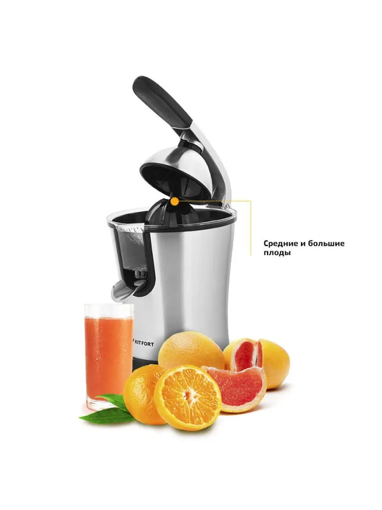 Соковыжималка Kitfort КТ-1108 с прижимным механизмом предназначена для отжима сока из цитрусовых плодов малого и среднего размера.