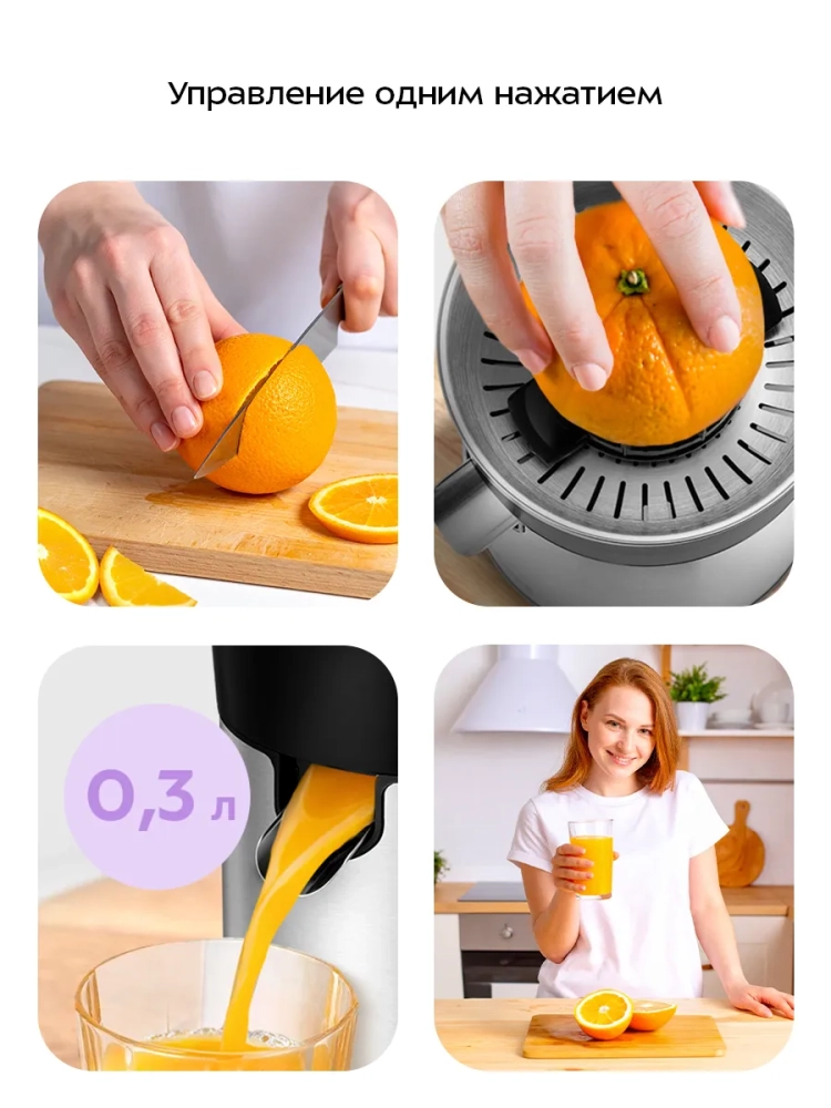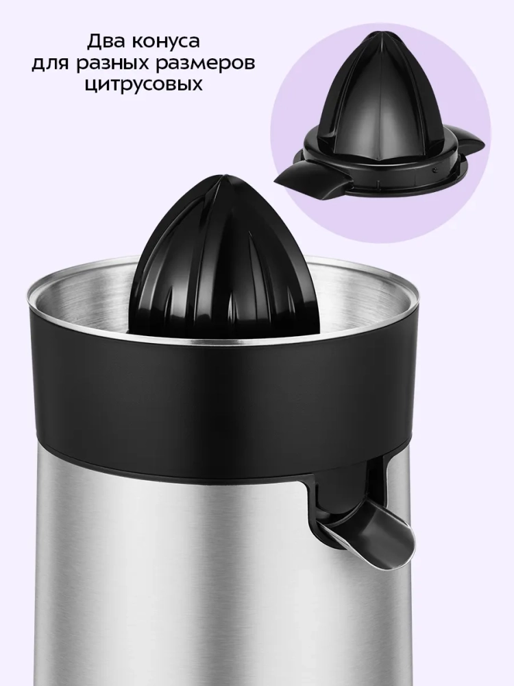 В комплекте к соковыжималке идет два конуса: малый конус для небольших плодов, таких как лимон или лайм, и большой конус для апельсинов, грейпфрутов и других крупных цитрусовых. Фильтр предотвращает попадание косточек и крупных кусков мякоти в сок.