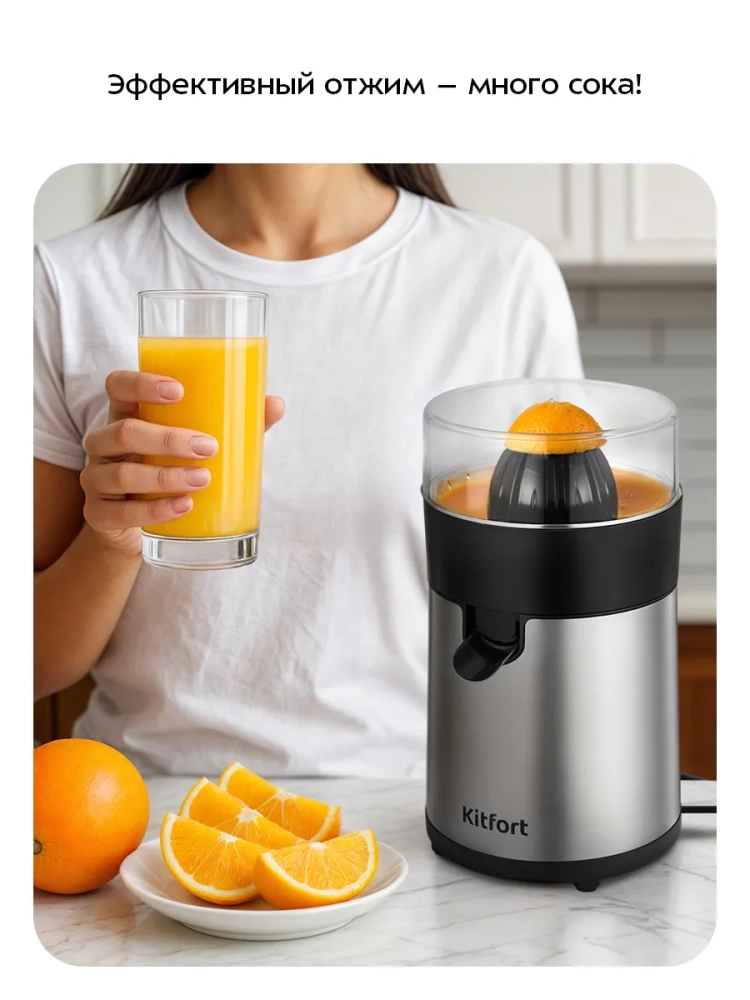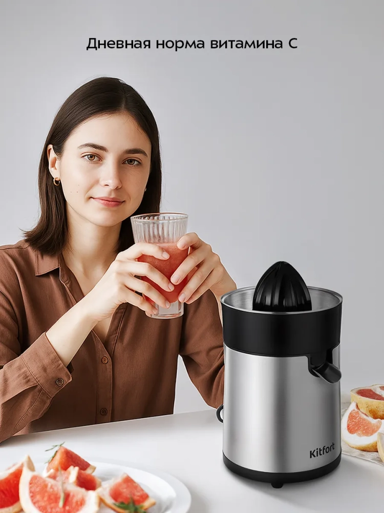 Соковыжималка для цитрусовых Kitfort КТ-1199 предназначена для отжима сока из плодов цитрусовых: лимонов, грейпфрутов, апельсинов и др. Главное преимущество соковыжималки для цитрусовых — для нее не требуется очищать цитрусы от кожуры: их лишь необходимо предварительно разрезать пополам поперек долек.
