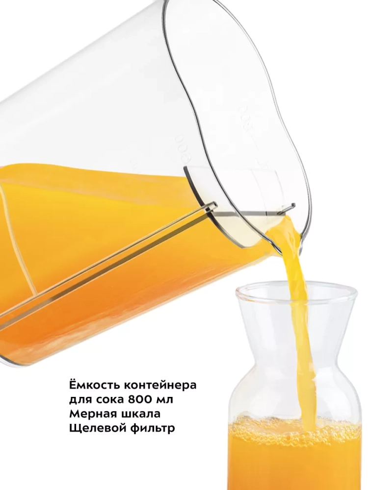 Центробежная соковыжималка позволяет отжимать практически любые фрукты, овощи и зелень. Для продуктов разной твердости предусмотрено 2 скорости. За счет большого диаметра загрузочной горловины можно загружать крупные продукты: целые яблоки, морковь и т.д. Также, благодаря высокой мощности двигателя, данная соковыжималка подходит для отжима сока в больших объемах. В контейнере для сока предусмотрен щелевой фильтр для отделения пены от сока.