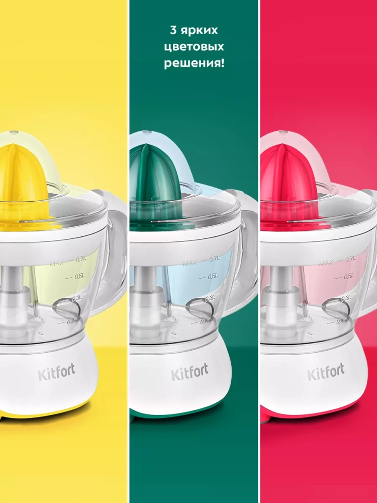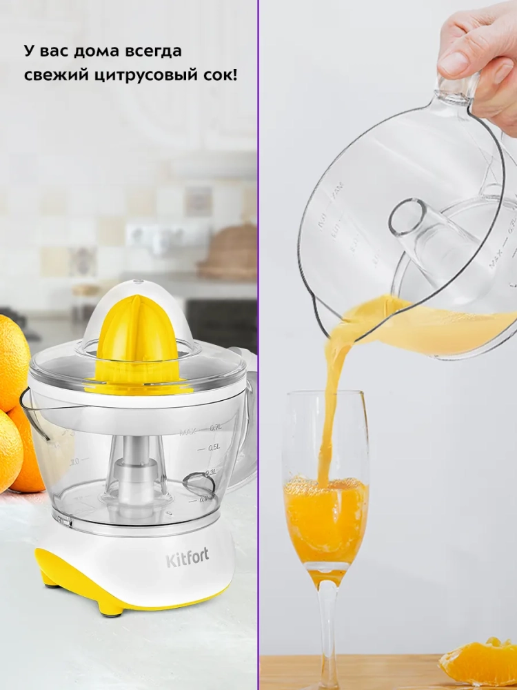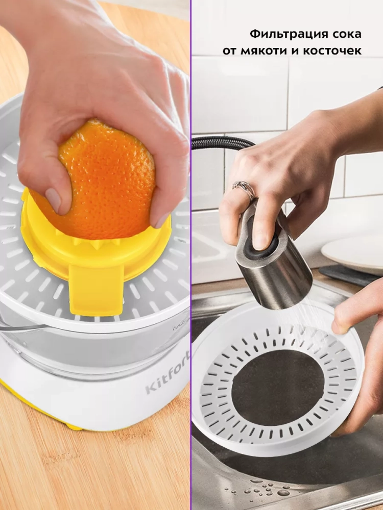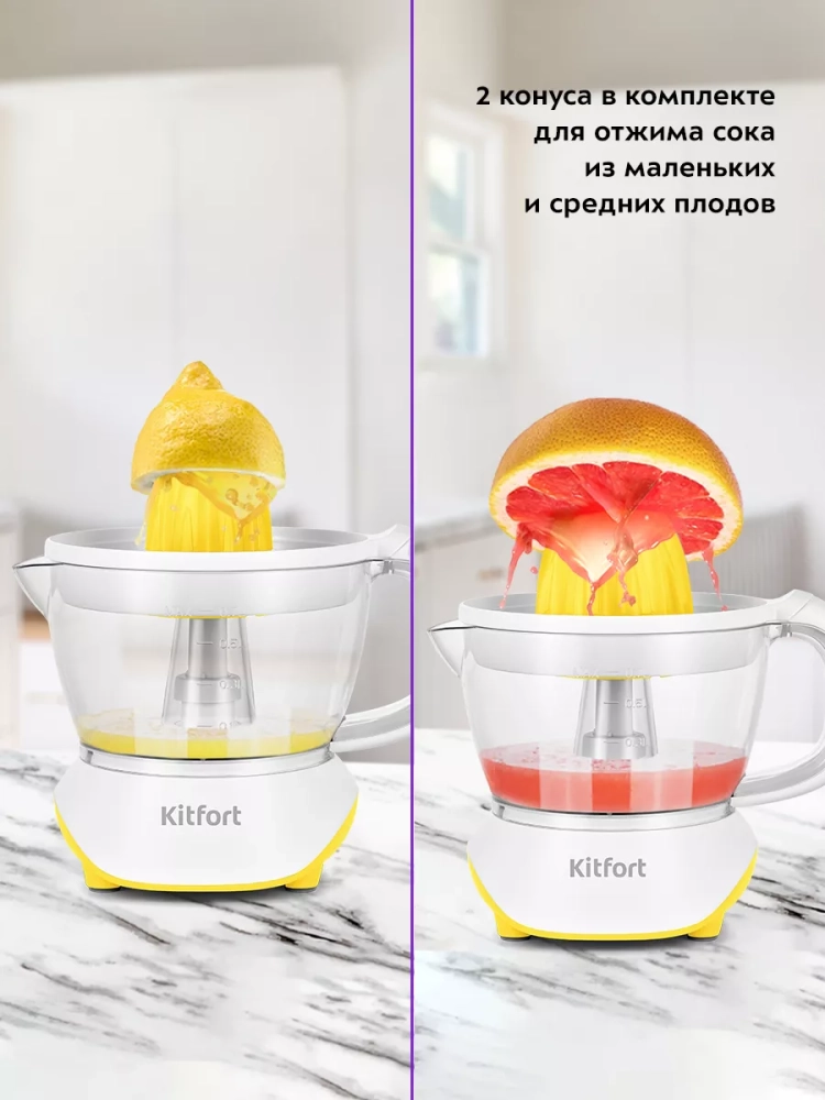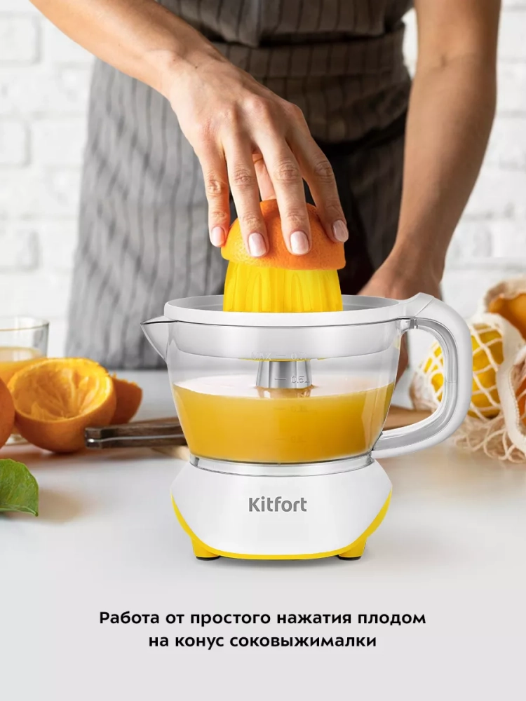 Соковыжималка Kitfort КТ-1147 предназначена для отжима сока из плодов цитрусовых: лимонов, грейпфрутов, апельсинов и др. Главное преимущество соковыжималки для цитрусовых — для нее не требуется очищать цитрусы от корки, их необходимо лишь предварительно разрезать пополам поперек долек.