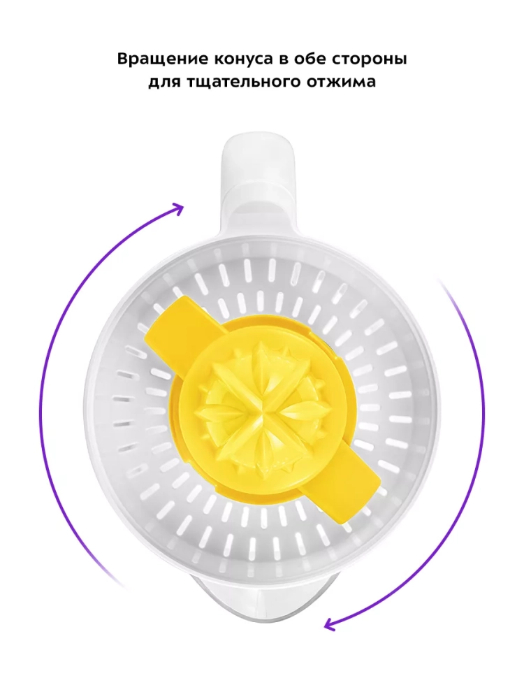 Чтобы привести соковыжималку в действие, нужно надавить плодом на конус для отжима сока, и конус начнет вращаться. Конус может вращаться в двух направлениях, что позволяет отжать из цитрусовых максимальное количество сока. Подача сока осуществляется в контейнер для сока. На контейнер для сока нанесена мерная шкала. Благодаря наличию фильтра крупные куски и косточки не попадают в сок. Удобный носик и ручка контейнера позволяют аккуратно перелить сок в другую емкость.