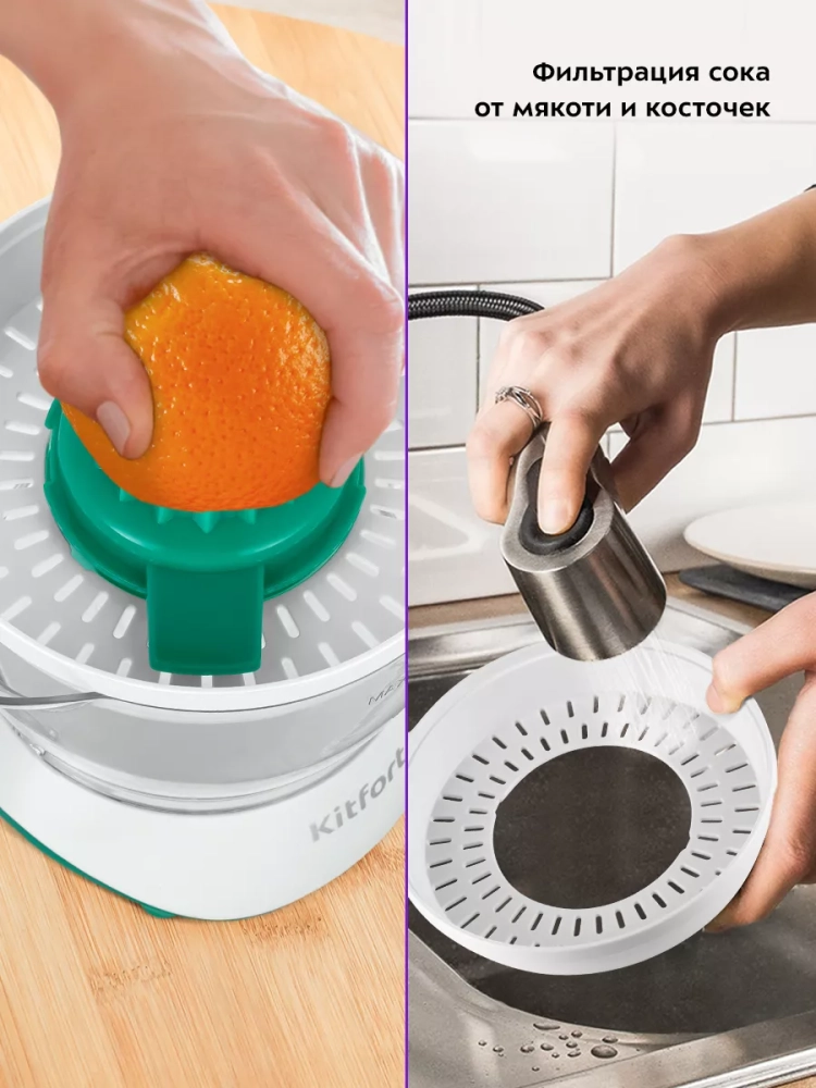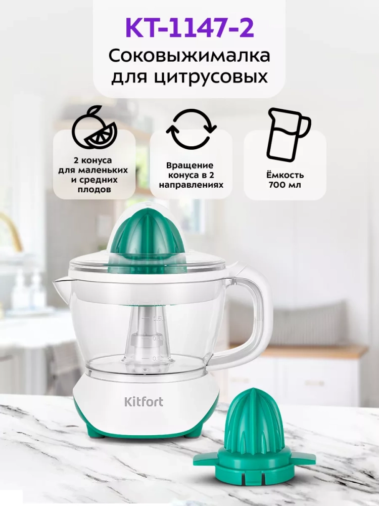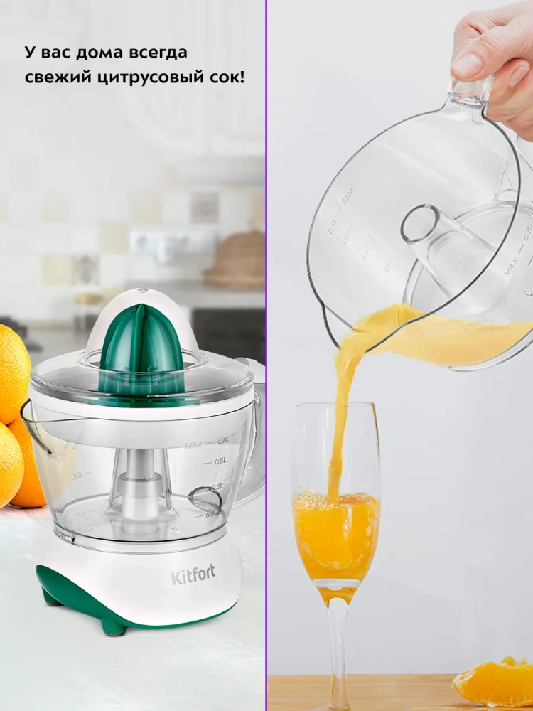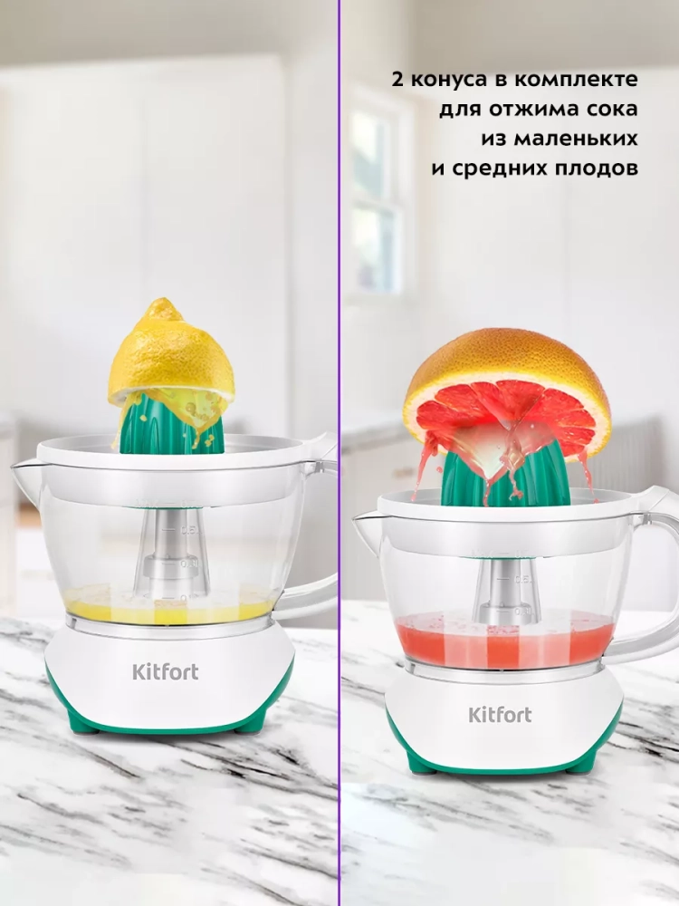 Соковыжималка Kitfort КТ-1147 предназначена для отжима сока из плодов цитрусовых: лимонов, грейпфрутов, апельсинов и др. Главное преимущество соковыжималки для цитрусовых — для нее не требуется очищать цитрусы от корки, их необходимо лишь предварительно разрезать пополам поперек долек.