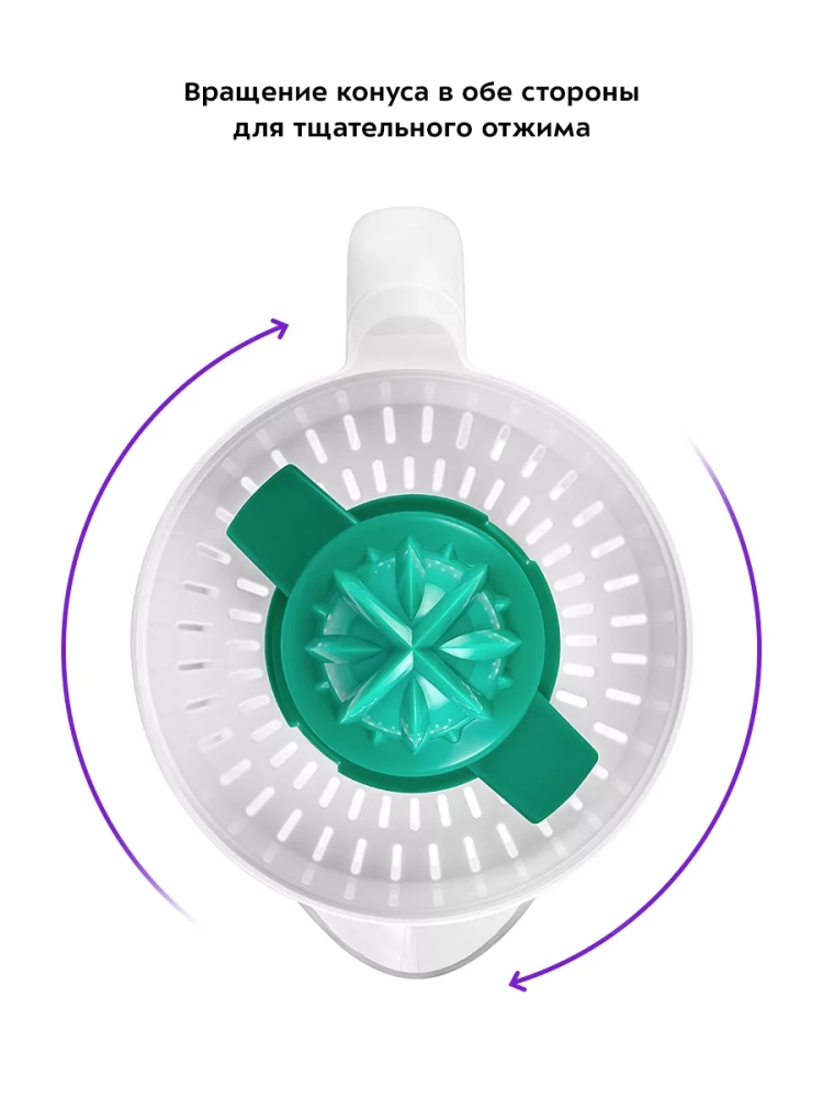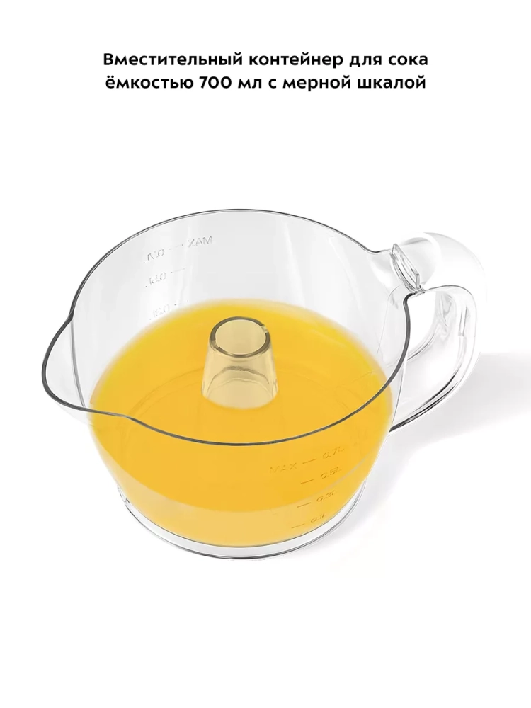 Чтобы привести соковыжималку в действие, нужно надавить плодом на конус для отжима сока, и конус начнет вращаться. Конус может вращаться в двух направлениях, что позволяет отжать из цитрусовых максимальное количество сока. Подача сока осуществляется в контейнер для сока. На контейнер для сока нанесена мерная шкала. Благодаря наличию фильтра крупные куски и косточки не попадают в сок. Удобный носик и ручка контейнера позволяют аккуратно перелить сок в другую емкость.