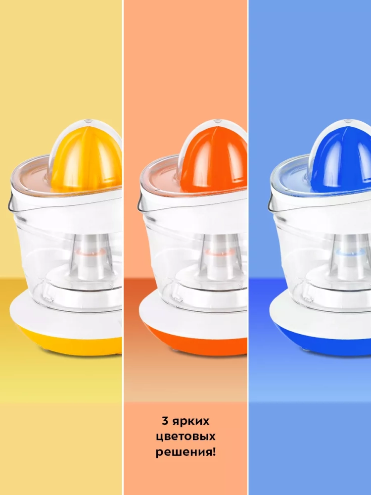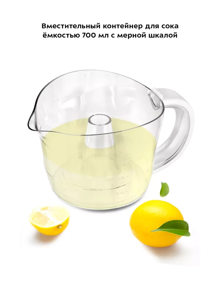 Чтобы привести соковыжималку в действие, нужно надавить плодом на конус для отжима сока, и конус начнет вращаться. Конус может вращаться в двух направлениях, что позволяет отжать из цитрусовых максимальное количество сока. Подача сока осуществляется в контейнер для сока. На контейнер для сока нанесена мерная шкала. Благодаря наличию фильтра крупные куски и косточки не попадают в сок. Удобный носик и ручка контейнера позволяют аккуратно перелить сок в другую емкость.