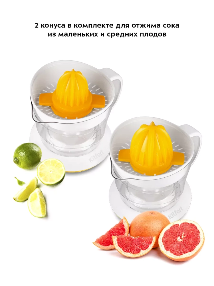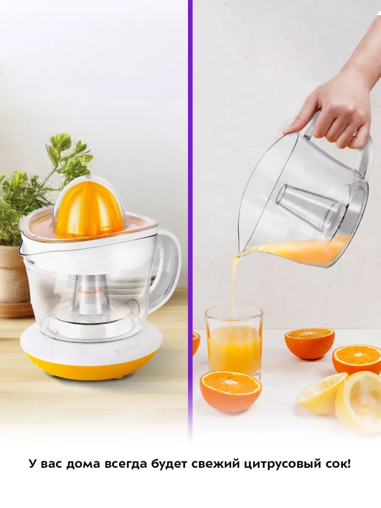 Соковыжималка Kitfort КТ-1148 предназначена для отжима сока из плодов цитрусовых: лимонов, грейпфрутов, апельсинов и др. Главное преимущество соковыжималки для цитрусовых — для нее не требуется очищать цитрусы от корки, их лишь необходимо предварительно разрезать пополам поперек долек.