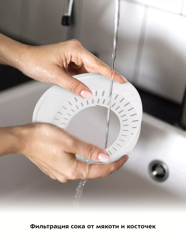 Крышка, конусы, фильтр, контейнер для сока, а также шпиндель легко снимаются и моются. Прорезиненные ножки не дают прибору скользить по столу во время отжима сока.