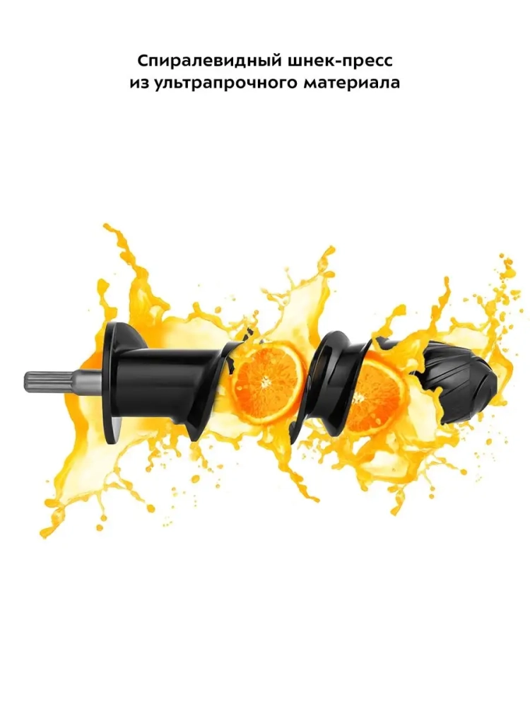Применение в соковыжималке суперпрочного отжимающего вала из современного и экологичного пластика — шнека, позволяет тщательно измельчить продукты, а затем продавливает их через прорези в фильтре. Жмых при такой переработке остается практически сухой, а количество сока — максимально возможное. При шнековом отжиме не происходит нагревание продукта, и сок получается с естественным ароматом, концентрированный и максимально полезный.