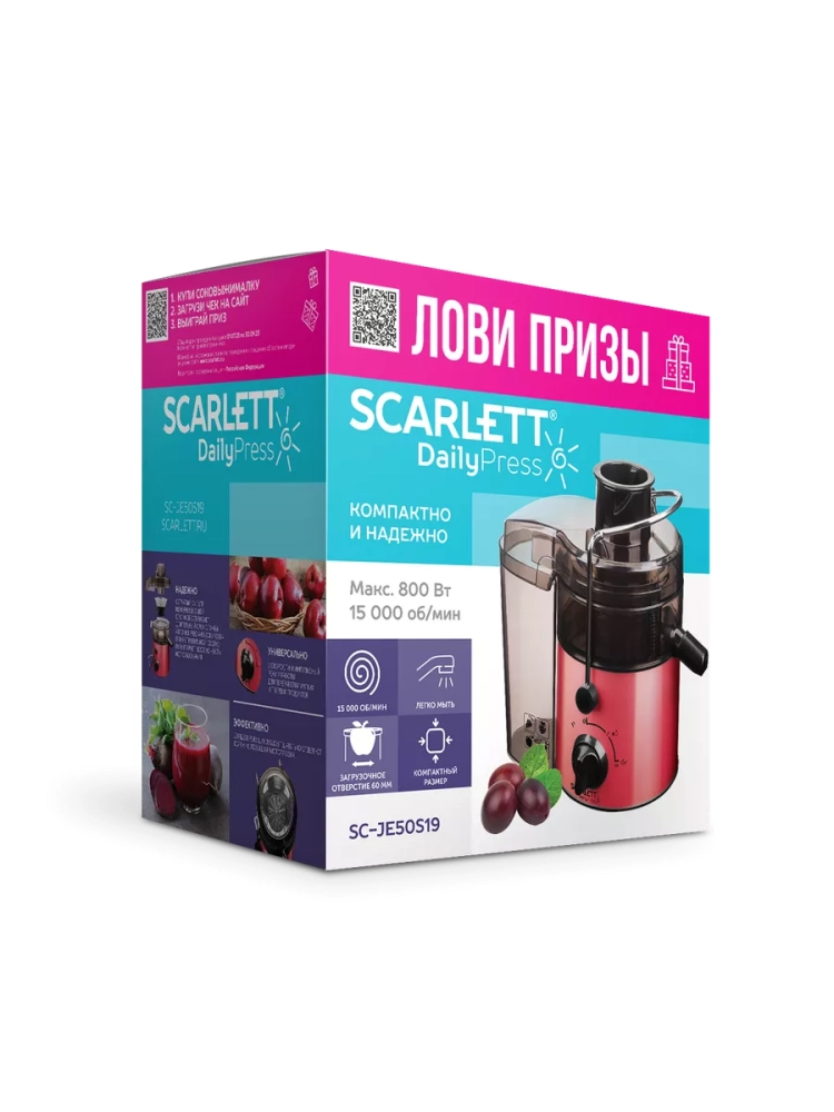 Центрифужная соковыжималка SC-JE50S19 мощностью 800 Вт выполнена в компактном размере: высота 27,2 см, ширина 25 см, глубина 16 см, что позволяет ей занимать места на кухне не больше, чем чайник. Долговечный сетчатый фильтр из нержавеющей стали позволит соковыжималке прослужить долго и качественно. Функция антикапля, металлический корпус и лёгкая сборка. Широкая горловина 60 мм для подачи целых фруктов и овощей значительно экономит время и силы! Прозрачная крышка для контроля заполняемости емкостей позволяет наблюдать за процессом. Емкость для сбора мякоти 1000 мл и емкость для сбора сока 600 мл в комплекте. 2 скорости и импульсный режим работы помогут выбрать подходящий для продуктов любой плотности. Автоматическая блокировка при неправильной сборке позаботится о безопасности эксплуатации!