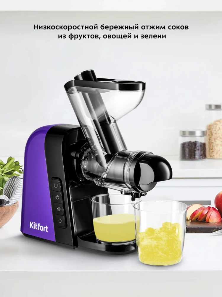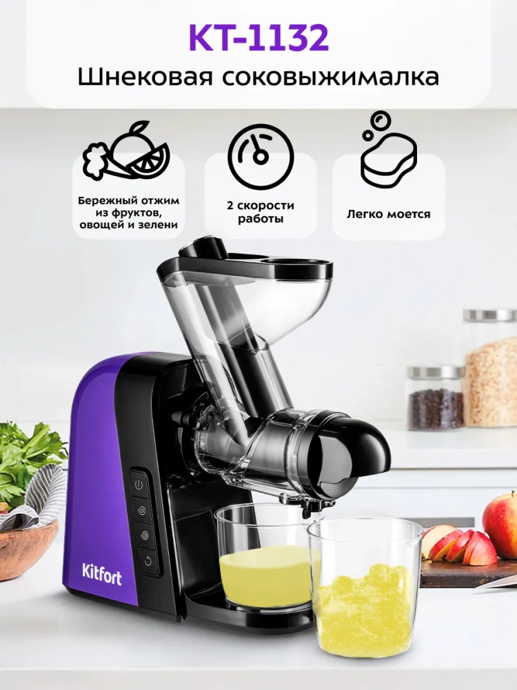 Шнековая соковыжималка Kitfort КТ-1132 позволяет отжимать максимально возможное количество сока из фруктов, большинства овощей и зелени с сохранением всех их полезных компонентов: витаминов, аминокислот и минералов. Кроме того, эта соковыжималка позволяет изготовить сок из листовых овощей (шпинат, базилик, петрушка, салат). Соковыжималка легко собирается и просто моется после работы. Шнековая соковыжималка работает на низких скоростях вращения. Однако, несмотря на малую скорость вращения, шнековая соковыжималка отжимает сок так же быстро, как и традиционная центробежная. Низкая скорость вращения обеспечивает более низкую температуру в процессе отжима в отличие от центробежной соковыжималки, что способствует сохранению питательной ценности продуктов. В шнековых соковыжималках принцип работы схож с мясорубкой: в загрузочную горловину подаются ингредиенты, далее шнек захватывает продукт, перемалывает его, выдавливает из него сок и проталкивает вперед жмых. Корпус соковыжималки КТ-1132 выполнен из прочного пластика, выдерживающего большие нагрузки. Он гладкий, и в случае загрязнения его легко протереть тряпочкой или губкой. Шнек отлит из ультрапрочного пластика, который хорошо выдерживает большие нагрузки, возникающие при отжиме. Контейнеры для сока и жмыха, толкатель сделаны из прочной пищевой пластмассы. Контейнеры и загрузочная горловина прозрачные, так что вы можете наблюдать за процессом отжима в деталях. Для мытья фильтра в комплекте к соковыжималке прилагается щетка с жестким ворсом, помогающая вычистить остатки мякоти. Соковыжималка оснащена функцией автоматического отключения через 20 минут непрерывной работы. В соковыжималке КТ-1132 предусмотрена система «Стоп-капля». После процесса отжима, убрав контейнер для сока, капли сока все еще могут стекать на стол. Чтобы подобных проблем не было на отверстии для выхода сока есть специальная заглушка, при закрывании которой сок не сможет вытекать.