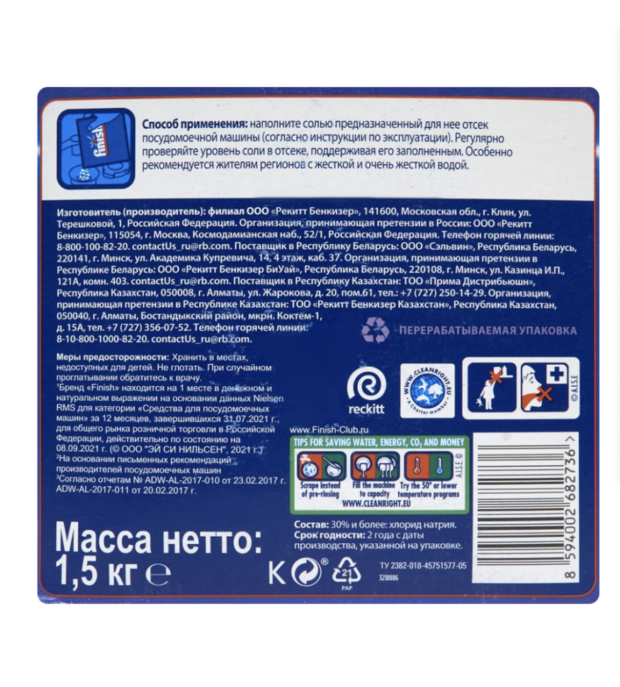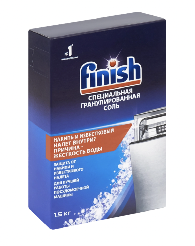 В упаковке 55x290x110 мм (ДxШxВ), вес 1595 г Полное название товара (у поставщика) Соль для посудомоечной машины FINISH, 1,5кг Способ применения, дозировка Наполните солью предназначенный для нее отсек посудомоечной машины (согласно инструкции по эксплуатации). Для лучшего результата регулярно проверяйте уровень соли в отсеке, поддерживая его заполненным. Особенно рекомендуется жителям регионов с жесткой водой. Производитель ООО «Рекитт Бенкизер» Меры предосторожности Не допускать проглатывания. Если продукт проглотили, обратиться к врачу. Условия хранения В сухом, прохладном месте. Вид упаковки Картонная упаковка Страна Россия. Соль для посудомоечной машины FINISH обладает 5 мощными функциями и состоит из очищенной соли, специально гранулированной для использования в посудомоечной машине. Продукт способствует правильной работе ионообменника, тем самым помогая смягчать воду и защищая посудомоечную машину от образования известкового налета, накипи, а также борется с появлением пятен и подтеков на посуде и стекле. Состав: Хлорид натрия.