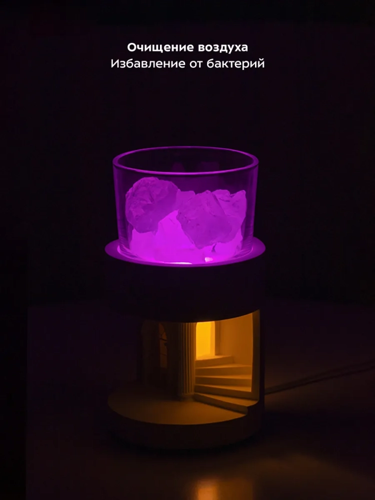 В основании лампы расположена подсветка, яркость которой можно плавно менять. Во время работы устройства кристаллы соли нагреваются и выделяют отрицательно заряженные ионы, которые делают воздух боле чистым и свежим.