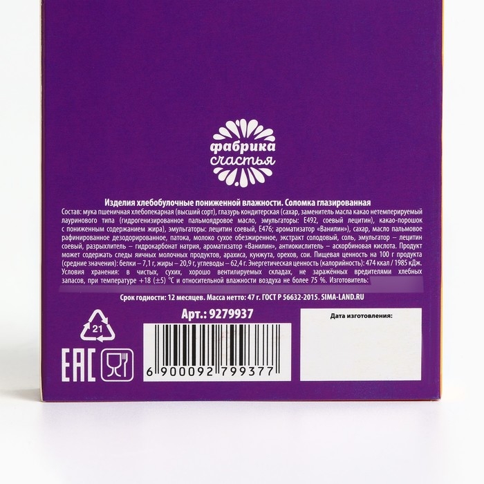 Состав: мука пшеничная хлебопекарная (высший сорт), масло растительное (подсолнечное), сахар, патока, глазурь кондитерская (сахар, заменитель масла какао нетемперируемый лауринового типа (масло пальмоядровое (стеарин) гидрогенизированное рафинированное дезодорированное, эмульгатор – сорбитан тристеарат (Е492)), какао-порошок, эмульгатор – лецитин соевый, ароматизатор «Ванилин».
