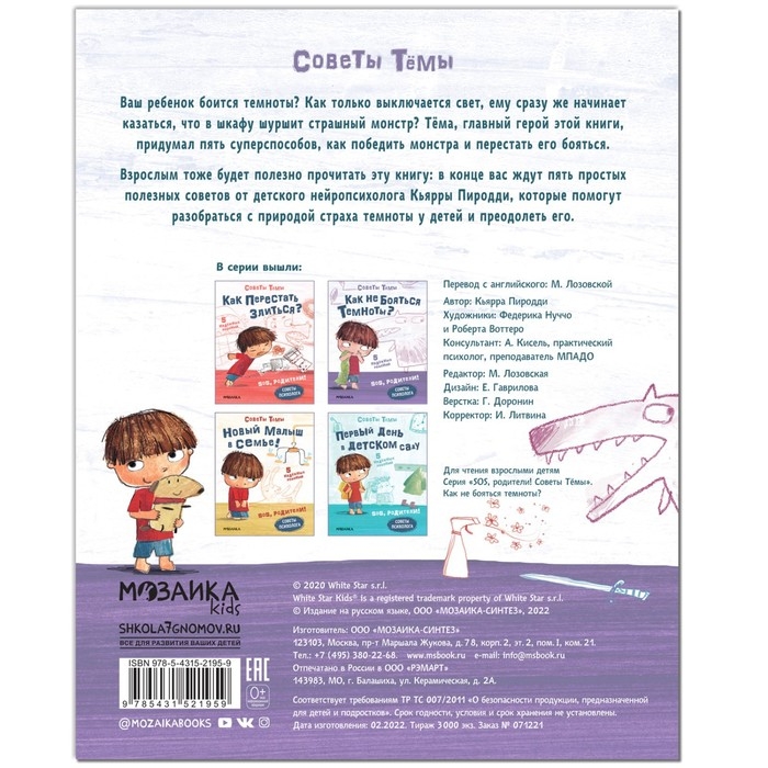 Взрослым тоже будет полезно прочитать эту книгу: в конце предлагается пять простых, но полезных советов от детского нейропсихолога Кьярры Пиродди, которые помогут разобраться с природой страха темноты у детей и преодолеть его.