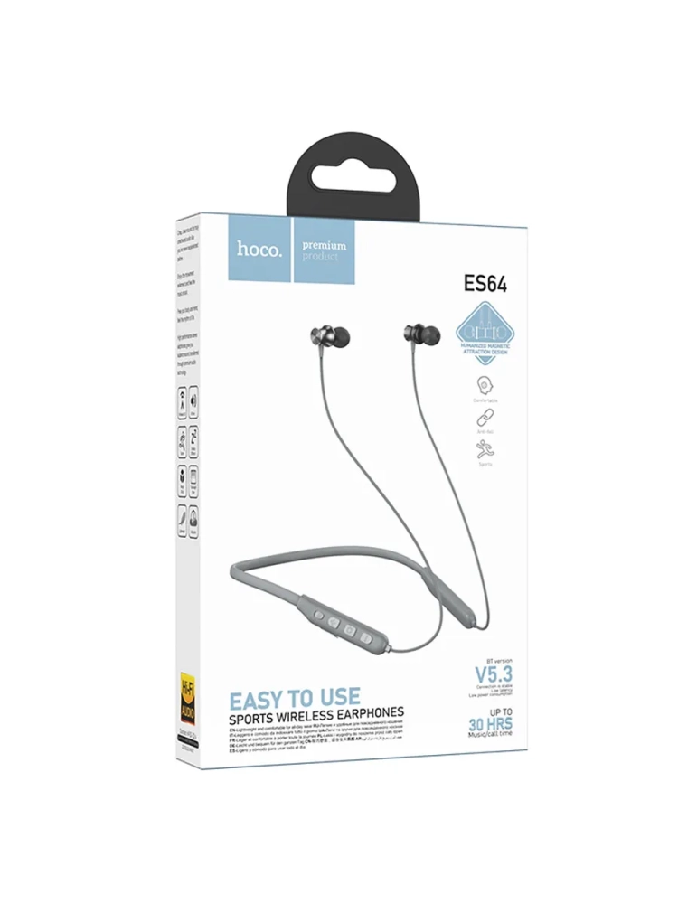 Наушники беспроводные для музыки и спорта с шейным ободом с микрофоном Hoco ES64. Главное преимущество наушников - полное отсутствие проводов. Наушники отлично подойдут для занятий спортом. Таким как бег и фитнес. Данная модель блютуз наушников оснащена: микрофоном. Обеспечат комфорт при прослушивании музыки и аудиокниг. Спортивные наушники с функцией магнитного притяжения предотвращают их запутывание и уберегут вас от потери. Наушники с микрофоном обладают невероятно четким качеством звука. Полной зарядки батареи хватает на 30 ч прослушивания и разговора: 30 часов работы и 350 часов в режиме ожидания. Общая длина - 96 см, вес - 26,5 грамм. Поддержка воспроизведения Bluetooth 5.3. Поддержка китайского и английского тональных сигналов: дважды щелкните многофункциональную клавишу в непарном состоянии. Батарея 200 мАч, быстрая зарядка внутриканальных наушников занимает около 2,5 часов.