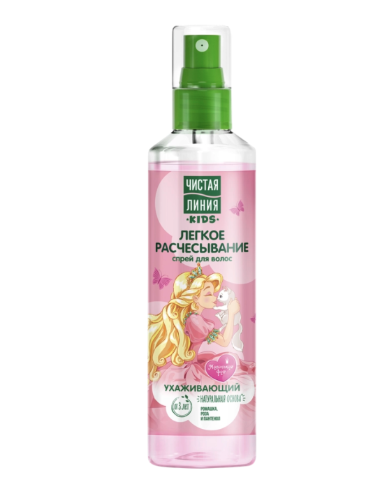 Спрей для волос детский ЧИСТАЯ ЛИНИЯ Ромашка, роза и пантенол, легкое расчесывание ухаживающий имеет натуральную основу и содержит природный кондиционер для волос. Масляный экстракт ромашки способствует росту волос и их укреплению. Экстракт лепестков розы увлажняет волосы и придает блеск. Пантенол смягчает и разглаживает волосы. После применения спрея для волос расчесывание становится в два раза легче! Подходит для ежедневного применения, как на влажных, так и на сухих волосах. Рекомендован для детей от 3-х лет.