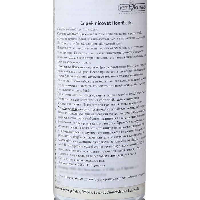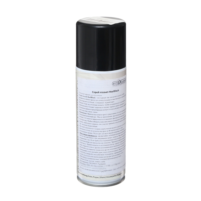 Спрей для копыт Черный HoofBlack - это черный лак для копыт и рогов, чтобы раскрасить копыто (рога) для показательных и выставочных мероприятий. Лак оставляет глубокий, глянцевый, черный цвет. Придает блеск, не уплотняя копыто, чтобы сохранить его естественную проницаемость. Создает защитную пленку черного цвета защищая от налипания навоза и предотвращая копыто от воздействия внешних факторов, таких как вода, песок, грязь.
