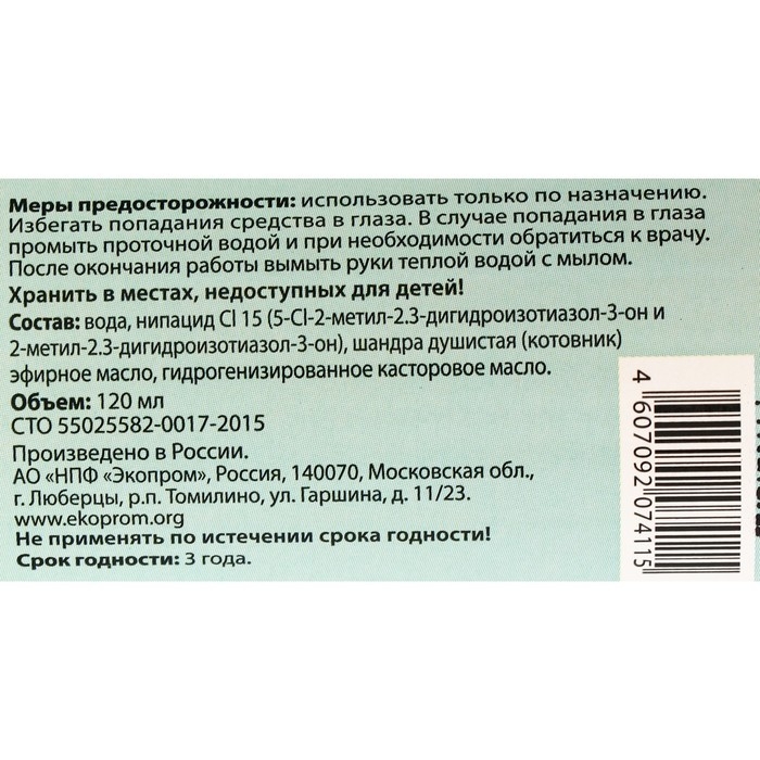 Состав: вода, нипацид CI 15 (5-CI-2-метил-2.3-дигидроизотиазол-3-он и 2-метил-2.3-дигидроизотиазол-3-он), шандра душистая (котовник) эфирное масло, гидрогенизированное касторовое масло.