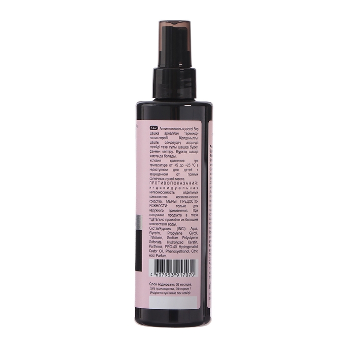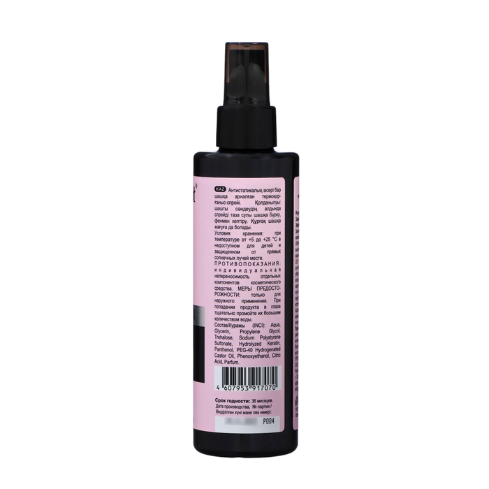Спрей обеспечивает защиту волос от высоких температур при использовании утюжка, фена и плойки (до 220 С). Спрей помогает снять антистатическое электричество и убрать пушение волос. Благодаря входящему в состав жидкому кератину образует легкую защитную пленку на поверхности волос, предотвращая потерю блеска, истончение и ломкость кончиков.