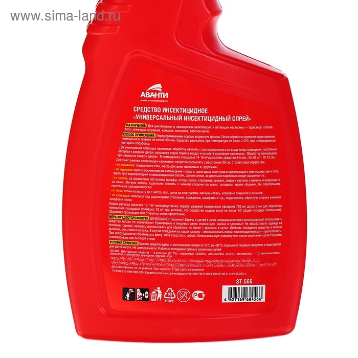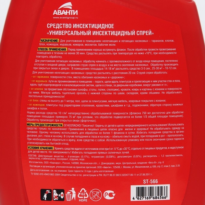 Описание товара Представленный спрей, готов к использованию с помощью маслянистой жидкости имеющей коричневый цвет. К ее основным свойствам относятся следующие факторы:Слабая растворимость в воде.Хорошая растворимость в спиртовом растворе, бензине и подобных растворителях органического происхождения.Не подвержен воздействию солнечных лучей.Имеет тенденцию разрушаться при воздействии со щелочами, скажем, раствором соды. Располагает высокой степенью летучести.Состав В контексте действующих компонентов данное средство содержит:Пиретроиды 4-аллетрин 0,17%.Тетраметрин 0,038%.Дельтаметрин 0,02%.Растворитель — 1,2-пропиленгликоль. Кроме того в состав спрея также входят: эмульгаторы, стабилизаторы и консерванты.Способ применения Непосредственно перед использованием флакон необходимо хорошенько встряхнуть. А по завершению обработки, помещение следует проветрить в течение получаса. При распылении средства температурный режим не должен быть ниже +10 градусов, в случае необходимости обработку можно повторить. Если нужно уничтожить летающих насекомых обработка производится, начиная с глубины помещения, следуя к двери, при этом струя спрея должна быть направлена в вверх и на самих насекомых. Обработка осуществляется, когда окна и двери закрыты.