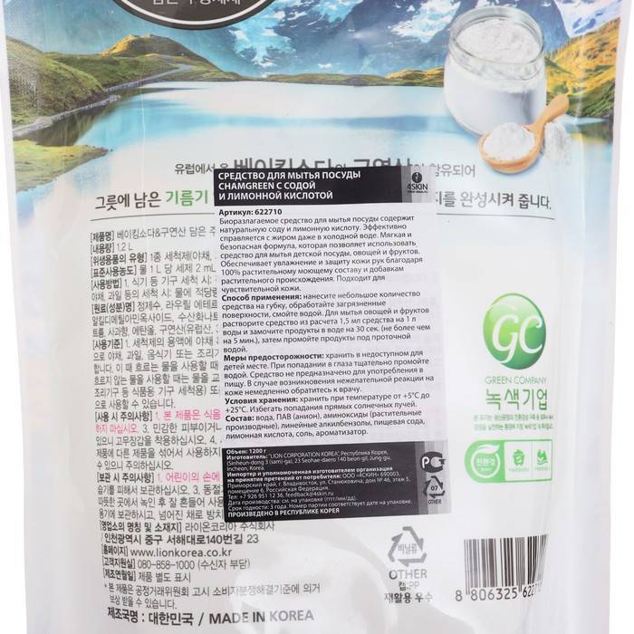 Средство для мытья посуды Lion Chamgreen, с содой и лимонной кислотой, 1.2 л