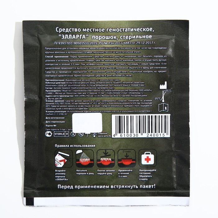 Действует «ЭЛЛАРГА» независимо от физиологических механизмов свертывания крови – средство остановит даже охлажденную кровь (при гипотермии) и кровь, в которой присутствуют такие антикоагулянты, как варфарин.