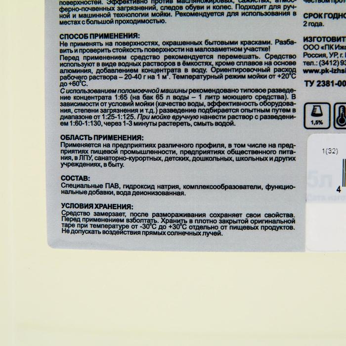 Низкопенное щелочное моющее средство. Для ежедневной и генеральной уборки керамогранита, линолеума, наливных полов и других водостойких поверхностей. Эффективно против масляножировых, сажистых, атмосферно-почвенных загрязнений, следов обуви и колес. Подходит для ручной и машинной технологии мойки. Рекомендуется для использования в местах с большой проходимостью. РН-2,5