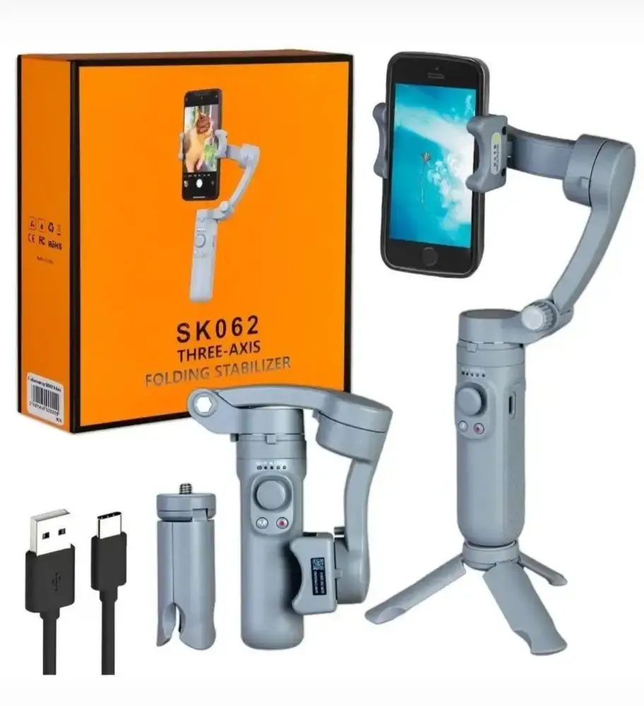 В комплект входят: стабилизатор SK062, компактный штатив-трипод, кабель USB-Type C и руководство пользователя на русском и английском языках.