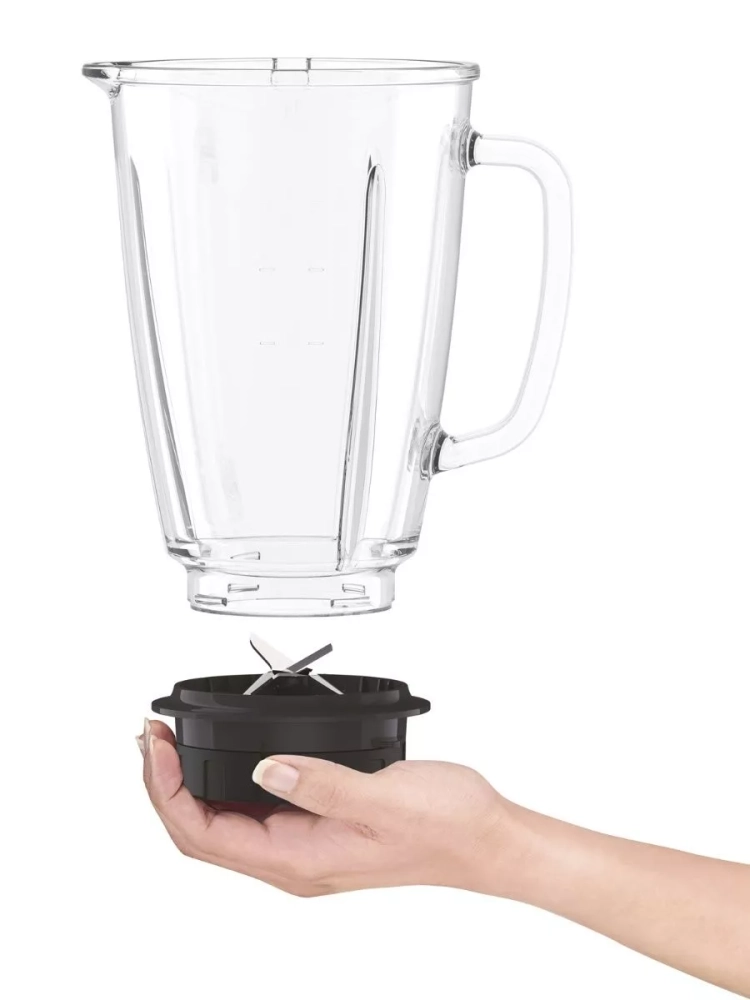 Настольный кухонный блендер оснащен большой стеклянной чашей вместимостью 1,75 литра, она выполнена из термостойкого стекла, которое способно выдерживать температуру до 80 °C. Новая автоматическая система Smart Lock, разработана для комфорта и безопасности при использовании прибора. Ножи будут заблокированы до того момента, пока вы правильно не установите и закрепите чашу блендера Мулинекс. Плавное переключение между 2 скоростями и импульсным режимом позволит вам добиться правильной текстуры для любого рецепта. А для того, чтобы очистить лезвия устройства просто отсоедините их одним нажатием и разделите на 2 части.