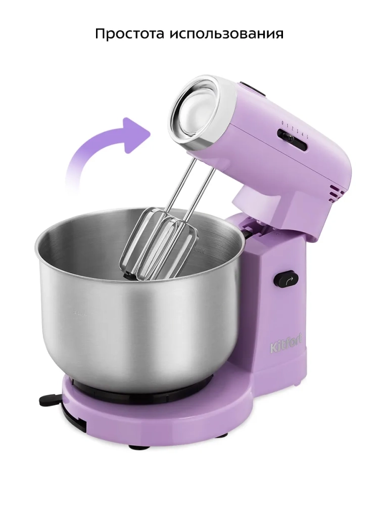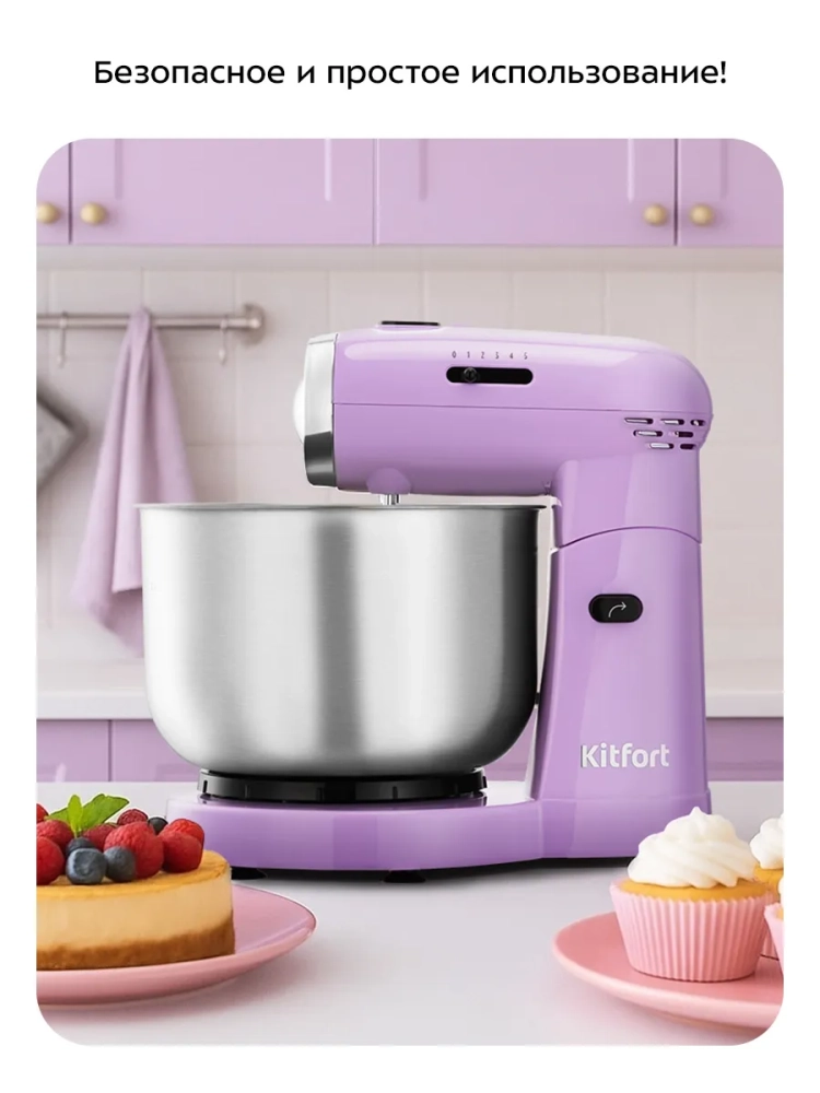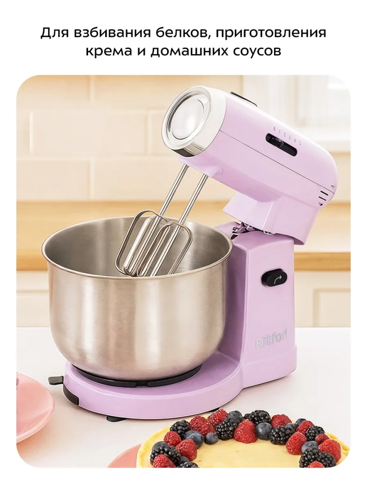 Стационарный миксер Kitfort КТ-4424 поможет взбить яичные белки, приготовить кремы, домашние соусы, а также жидкое тесто, например для шарлотки, или густое — для сдобной выпечки. Миксер подходит для замешивания легких и плотных смесей, но не для замешивания тугого теста, например, для пельменей. Во время работы насадки вращаются вокруг своей оси. При использовании миксера с венчиками для взбивания чаша будет вращаться благодаря специальной пластиковой вставке на одном из венчиков. При использовании крюков для замешивания чашу можно вращать вручную при необходимости, чтобы ингредиенты смешивались без комочков. Подставку с чашей можно перемещать для равномерного смешивания продуктов в чаше. Пользоваться устройством очень просто. Вам достаточно только установить насадки, положить ингредиенты в чашу и включить прибор домашний кондитер. Это освободит вас от участия в процессе взбивания и перемешивания, а также позволит добавлять ингредиенты в чашу прямо в процессе смешивания. У миксера 5 скоростей работы, благодаря чему вы сможете выбрать подходящую скорость для взбивания или смешивания ингредиентов. В комплекте с устройством поставляются два вида насадок: венчики подходят для взбивания ингредиентов и замешивания жидкого теста для блинов, вафель или бисквитов, а крюки — для замешивания более плотного теста, например песочного или дрожжевого. Для снятия насадок достаточно одного нажатия на кнопку, поэтому их легко менять и мыть. Напряжение: ~220–240 В, 50/60 Гц. Мощность: 300 Вт. Класс защиты от поражения электрическим током: II. Количество скоростей: 5. Емкость чаши: 3,2 л. Материал чаши: нержавеющая сталь. Уровень шума: ≤85 дБ. Длина шнура: 1,1 м. Размер устройства: 300 × 207 × 270 мм.