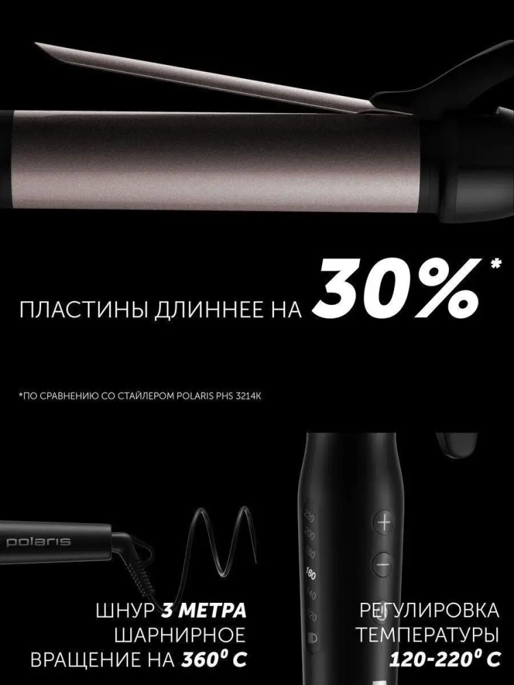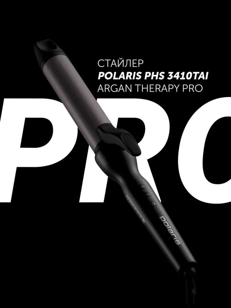 Профессиональный cтайлер Polaris PHS 3410TAi Argan Therapy PRO поможет создать объемные локоны. Технология Argan Therapy (добавление арганового масла в керамические пластины) оказывает положительное влияние на структуру волос, сохраняя их внутреннюю влагу и здоровый внешний вид. Одновременное воздействие Argan Therapy и турмалиновой ионизации создает эффект запаянных кончиков волос, делая их живыми и блестящими. В зависимости от типа волос и желаемого результата вы можете регулировать температуру нагрева от 120 до 220 градусов. Удлиненные пластины 150 мм удобны для укладки даже длинных волос. В наборе вы найдете термосумку-коврик, на которой можно оставить нагретый прибор во время укладки. Стайлер оснащен функцией защиты от перегрева и автоотключения через 60 минут, на случай если вы забыли выключить прибор. Шнур длиною 3 метра не перекручивается благодаря шарнирному вращению на 360 градусов. Матовое покрытие Soft Touch делает стайлер приятным на ощупь и не дает скользить в руках.