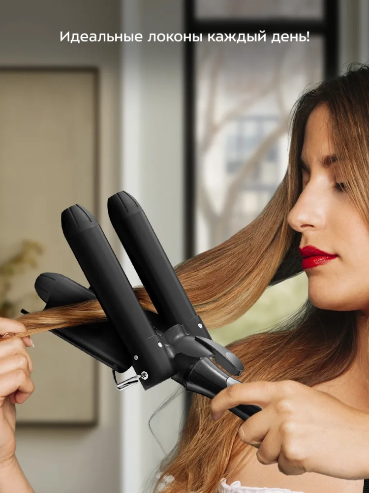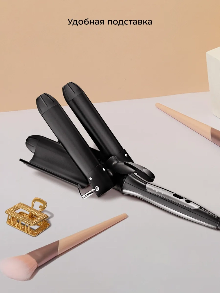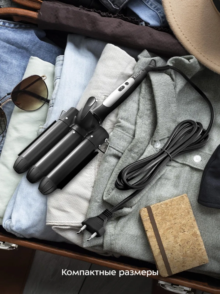 Стайлер для волос Kitfort KT-3282 позволит уложить волосы красивыми волнами. Укладка не займет много времени, так как рабочая поверхность стайлера имеет сразу три нагревательных элемента (цилиндра) диаметром 32 мм. Керамическое покрытие рабочей поверхности бережно выравнивает волосы, делая их гладкими и блестящими, а также снимает статическое электричество. Вы можете установить температуру нагрева от 80 до 210 °C с шагом 10 °C. Стайлер готов к работе через 1–5 минут в зависимости от выбранной температуры. Однократное нажатие на кнопку «Вкл/Выкл» переключает отображение температуры с градусов Цельсия на градусы Фаренгейта и обратно. Шнур оснащен защитой от перегиба, что увеличивает срок службы прибора. На защите от перегиба находится петля для подвесного хранения. Вращение шнура на 360° обеспечивает удобство в использовании — провод не сматывается и не путается при повороте устройства. Устройство имеет функцию автоотключения через час работы. Также у прибора есть специальная подставка, благодаря которой нагретая рабочая поверхность прибора не контактирует с поверхностью, на которую установлен стайлер. Однако будьте внимательны, сама подставка тоже нагревается. Напряжение: ~110–240 В, 50/60 Гц. Мощность: 120 Вт. Класс защиты от поражения электрическим током: II. Покрытие рабочей поверхности: керамика. Диаметр цилиндра: 32 мм. Температура нагрева: 80–210 °С с шагом 10 °С. Время нагрева: 1–5 мин. Длина шнура: 1,6 м. Размер устройства: 335 х 120 х 82 мм.