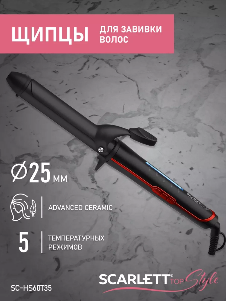 Стильные и удобные щипцы для укладки волос SC-HS60T35 подойдут для создания идеальных локонов, крупных кудрей, укладки челки. Керамическое покрытие стайлера равномерно распределяет тепло, не пересушивает и не повреждает волосы, сохраняя естественный блеск, красоту и здоровье волос. Удобное управление температурными режимами поможет быстро и просто подобрать необходимую температуру под тип и состояние волос. Универсальный диаметр 25 мм подходит для создания локонов на волосах любой длины.