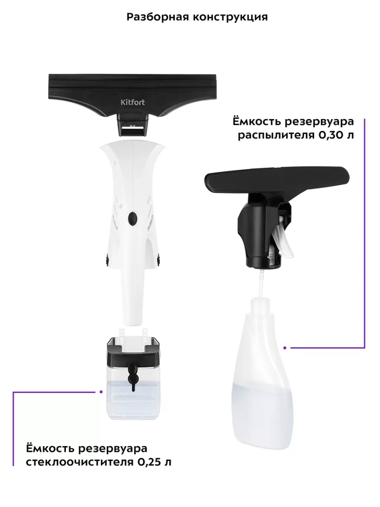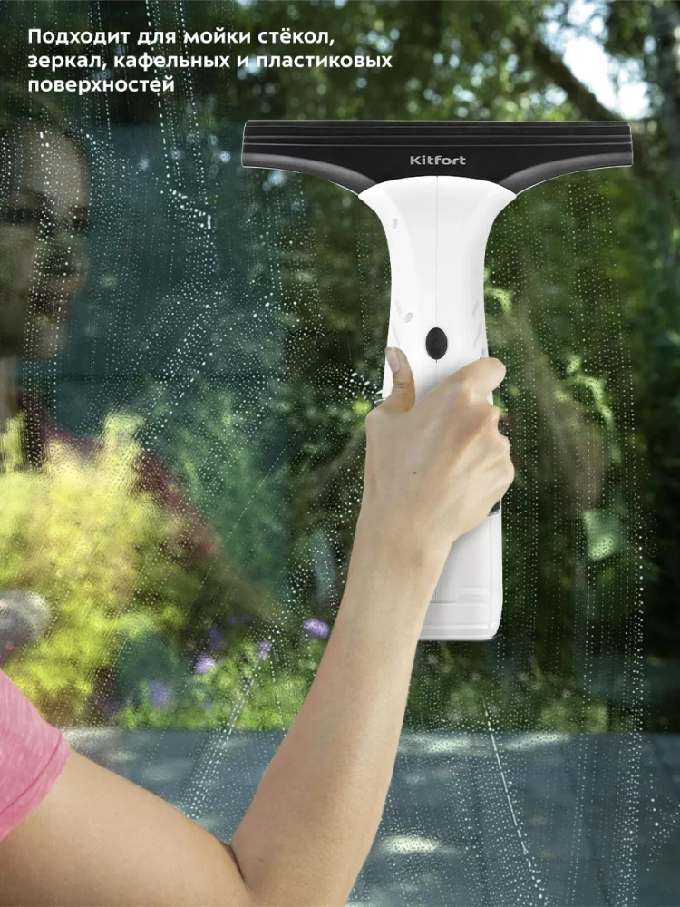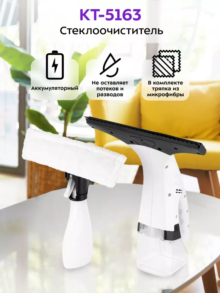 Стеклоочиститель Kitfort КТ-5163 — это набор для мойки стекол, зеркал, кафельных и пластиковых поверхностей. В комплект входит распылитель, тряпка из микрофибры и сам стеклоочиститель — небольшой аккумуляторный пылесос со скребком для всасывания жидкостей с плоских поверхностей и ее очистки.