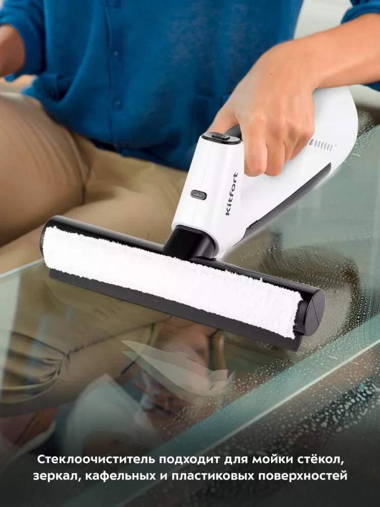 Стеклоочиститель Kitfort КТ-5209 — это набор для мойки стекол, зеркал, кафельных и пластиковых поверхностей. В комплект входит тряпка из микрофибры, фильтр для разделения воды и воздуха при сборе воды и сам стеклоочиститель — небольшой аккумуляторный пылесос со скребком для всасывания жидкостей и очистки плоских влагостойких поверхностей. В корпус прибора встроен распылитель, который позволит вам быстро и удобно увлажнить водой очищаемую поверхность.