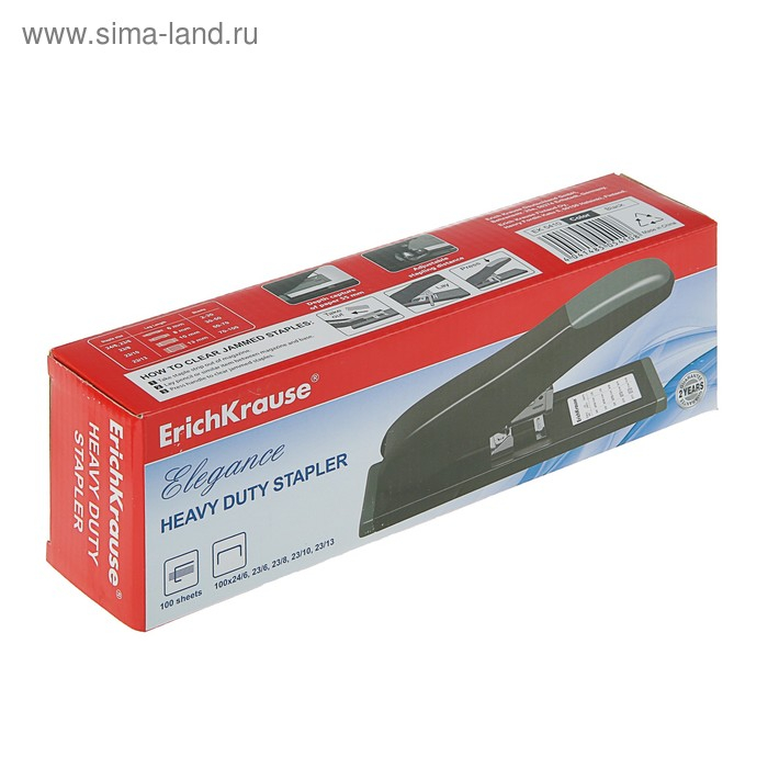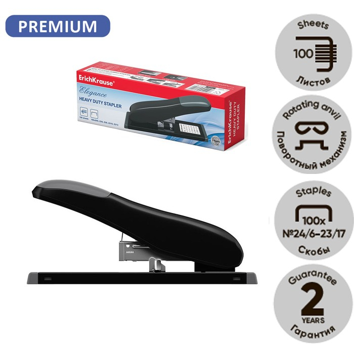 Степлер мощный, до 90 листов, ErichKrause Elegance, скобы №24/6, 23/6, 23/8, 23/10, 23/13, вмещает до 100 скоб, глубина закладки до 55 мм, чёрный