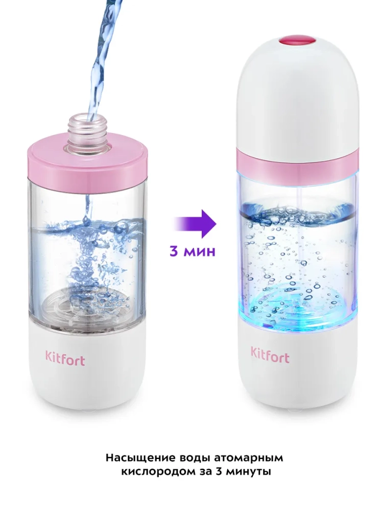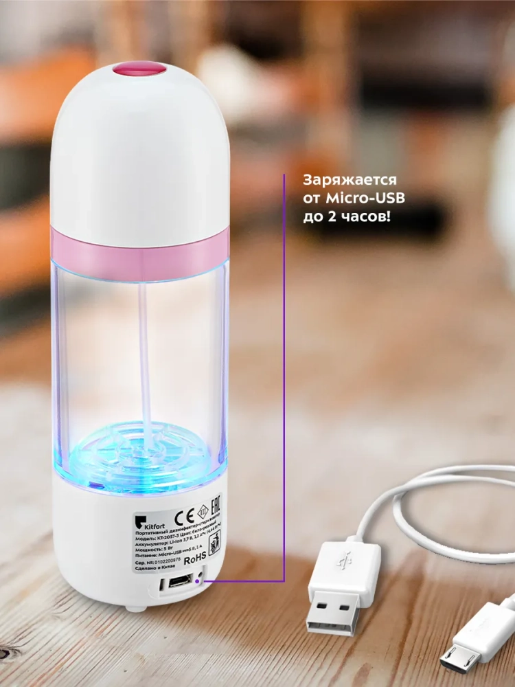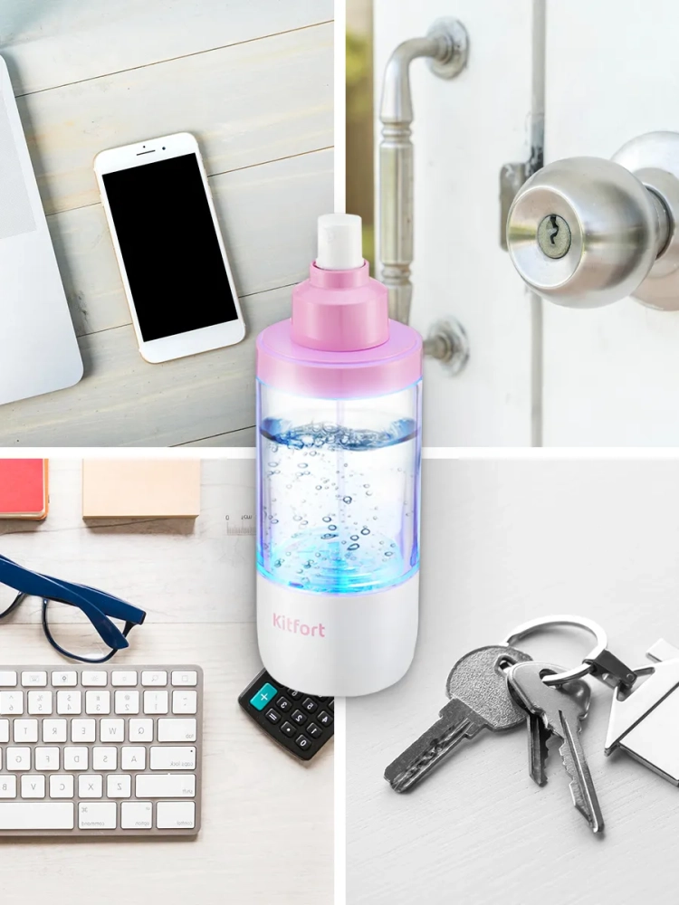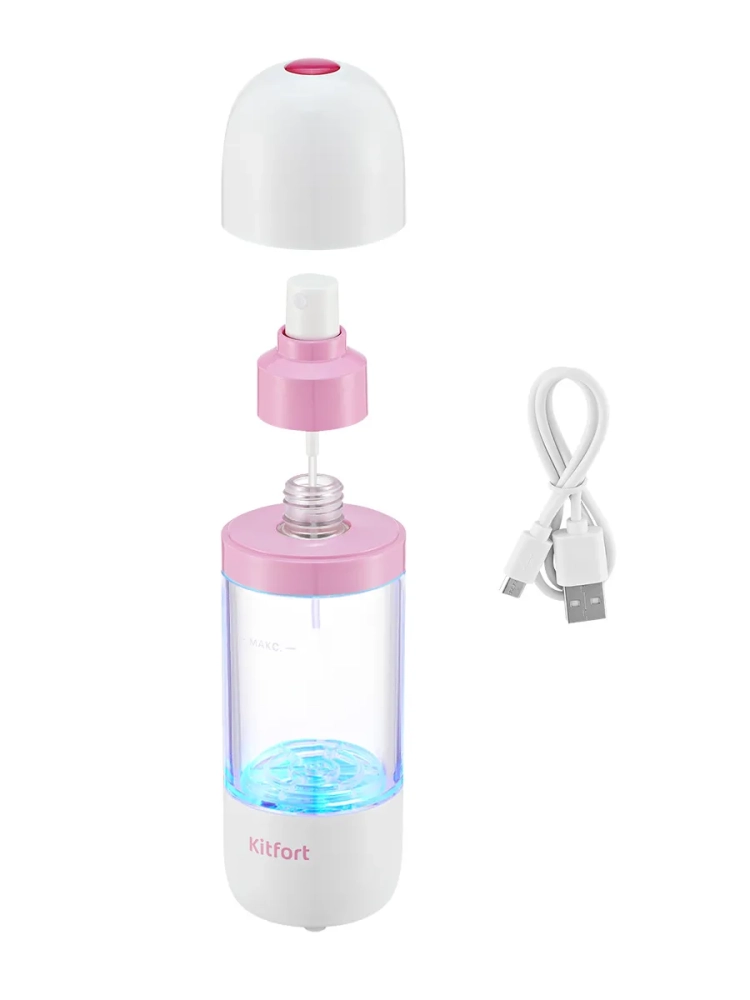 Дезинфектор-стерилизатор Kitfort KT-2057 идеальное устройство для тех, кто ценит свое здоровье и стерильность во всем доме. Стерилизатор Китфорт KT-2057 насыщает воду атомарным кислородом, который эффективен в борьбе с бактериями, вирусами и другими микроорганизмами. Вода, насыщенная атомарным кислородом, обеззаразит предметы частого использования и руки, очистит овощи и фрукты. Насыщенную атомарным кислородом воду можно использовать для дезинфекции любых предметов, например телефона, рабочего места, ручек дверей и многого другого. Благодаря встроенному распылителю стерилизатором удобно пользоваться. Стерилизатор KT-2057 способен заменить привычные антисептики на основе спирта без вреда для кожи рук. В отличие от химических дезинфекторов атомарный кислород не вызывает аллергии. Существует ряд материалов, для которых воздействие атомарного кислорода губительно. К таким материалам относятся некоторые виды металлов и пластиков, натуральная резина. Рекомендуется не обрабатывать ювелирные изделия из серебра водой, насыщенной атомарным кислородом, — серебро под воздействием атомарного кислорода потемнеет. Корпус стерилизатора выполнен из прозрачного пластика, что позволяет наблюдать, как протекает электролиз. Встроенная подсветка покажет, когда в устройстве идет процесс электролиза, а также необходимость зарядить аккумулятор. Управление стерилизатором осуществляется всего одной кнопкой. В комплекте есть шнур Micro-USB для зарядки стерилизатора. Для полной зарядки аккумулятора стерилизатора потребуется около 2 часов. Для приготовления одной порции кислородной воды потребуется около 3 минут. Полного заряда аккумулятора хватит приблизительно на 30 циклов работы стерилизатора. Мощность: 5 Вт. Длина шнура Micro-USB: 0,5 м. Емкость резервуара для воды: 130 мл. Примерное время полной зарядки аккумулятора: 2 часа. Примерное время работы в течение одного цикла: 3 минуты. Примерное количество циклов работы: 30.
