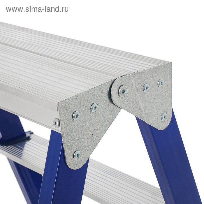 Стремянка выполнена из лёгких, но прочных материалов: каркас — из окрашенной стали, ступени — из алюминия.