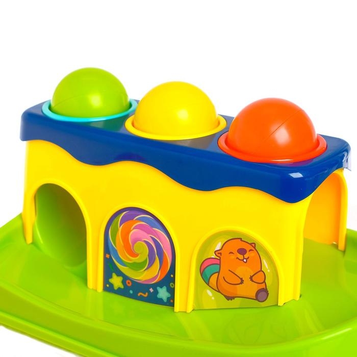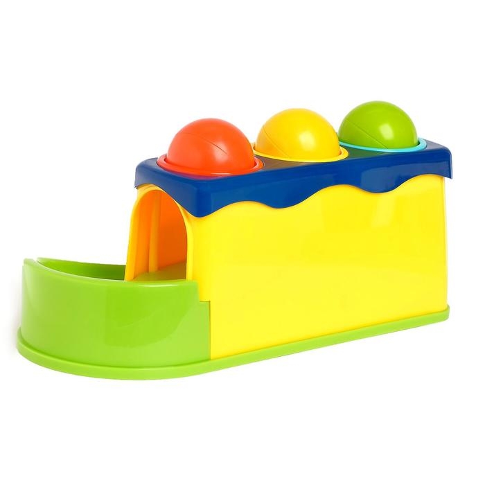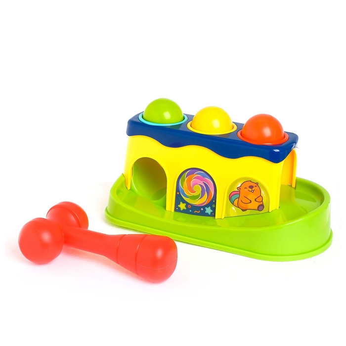 Ребёнок будет бить молоточком по шарикам и наблюдать, как они скатываются вниз по горке.