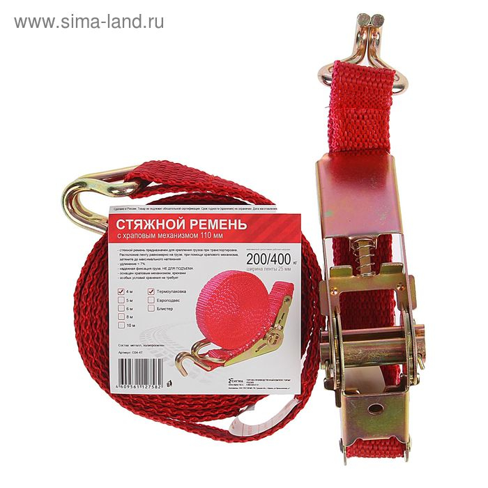 Стяжка груза с механизмом 110 мм, ширина ленты 25 мм, нагрузка 200/400 кг, длина 4 м