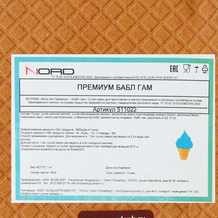 - Для получения мягкого мороженого 1 кг сухой смеси растворить в 2,3 – 2.5 л воды или молока, смешать и выдержать 20 минут перед заливкой во фризер.