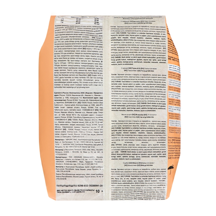 Состав: зерновые культуры и продукты их переработки, мука КРС, куриная мука, кукурузный глютен, животные жиры и масла, свекольный жом, дрожжи сухие, витамины, микроэлементы, метионин, таурин.