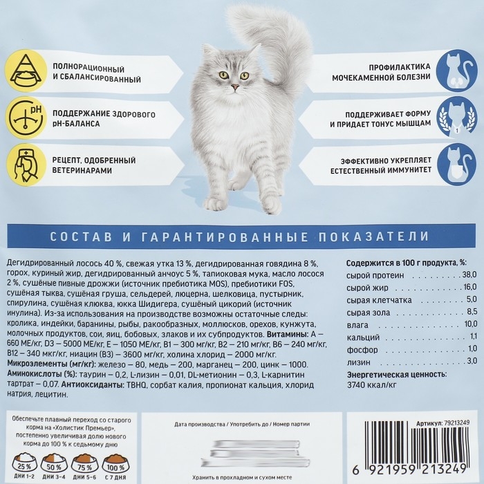 Серия полнорационных кормов Холистик Премьер «Для кастрированных и стерилизованных» разработана специально для котов и кошек, с особыми потребностями в рационе. Идеально сбалансированный, обогащенный необходимыми витаминами и аминокислотами, этот корм обеспечивает контроль за весом, поддерживает здоровье мочевыводящих путей и общего физического состояния. Состав: дегидрированный лосось 40%,