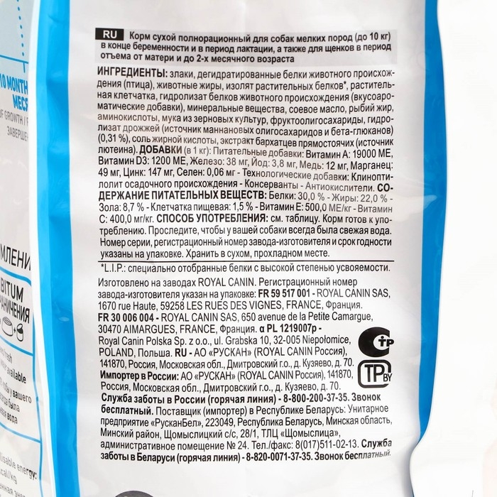 Содержание питательных веществ адаптировано к энергетическим потребностям матери и щенков мелких пород в период лактации